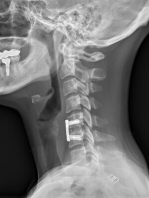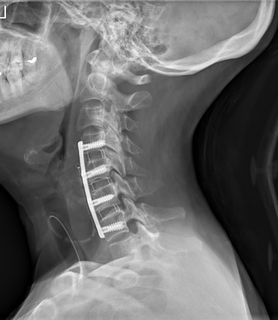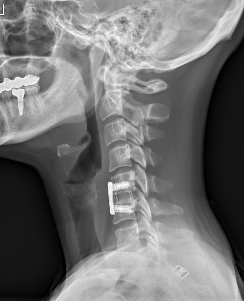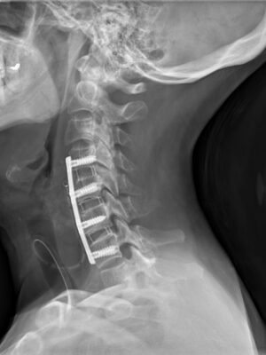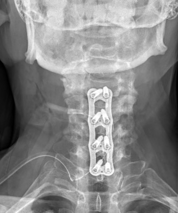 Krční páteř operujeme nejčastěji z předního přístupu. Příčným řezem v tzv čárách štěpitelnosti kůže (vráskách) se dostaneme k postiženému segmentu páteře. Po odstranění meziobratlové ploténky a osteofytů, které utlačovaly nervové struktury nahradíme vyplníme meziobratlový prostor implantátem vyplněným kostním štěpem odebraným z lopaty kosti kyčelní a obratlová těla fixujeme speciální krční dlahou.